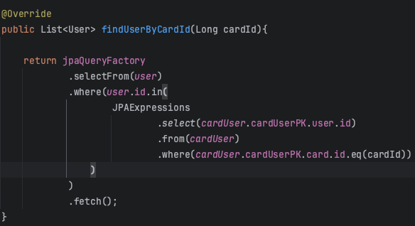 user와 cardUser는 Quser.user, QcardUser.cardUser 를 static import한 것이다.